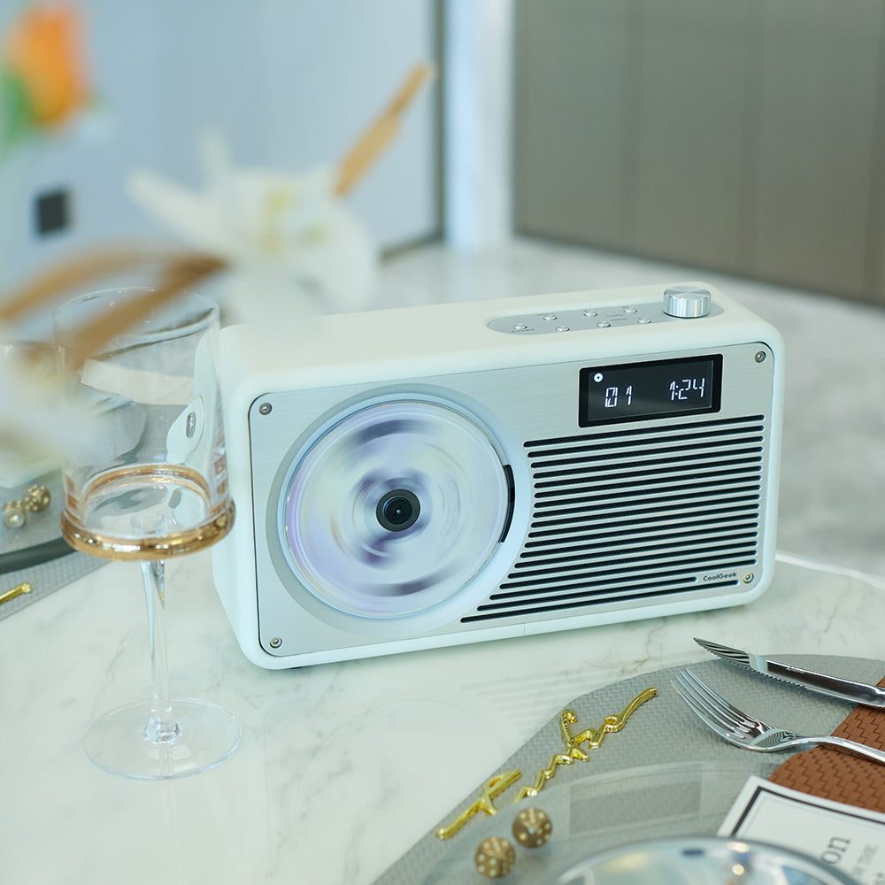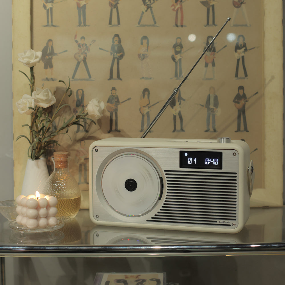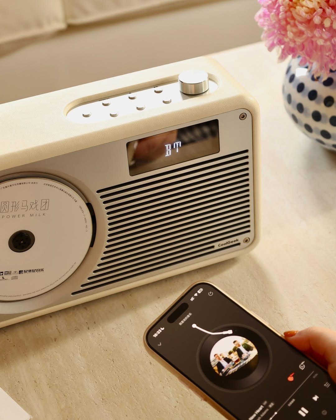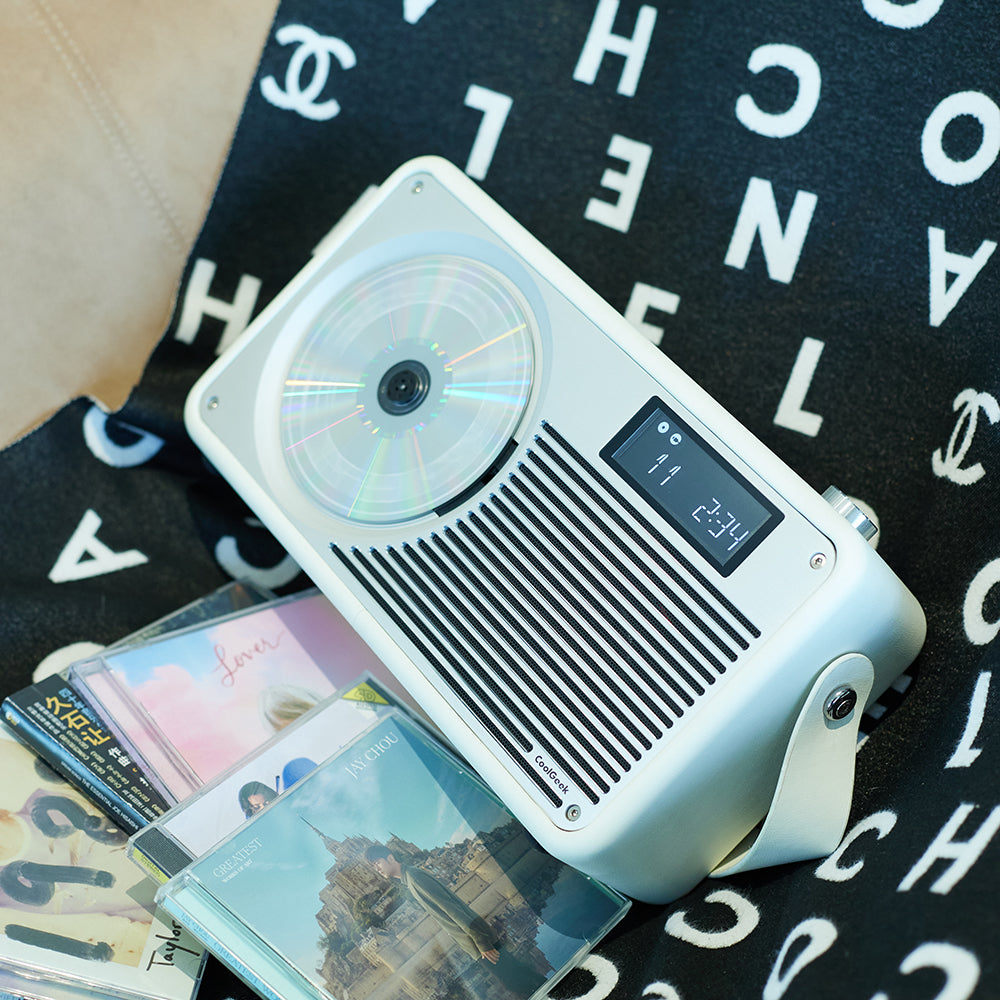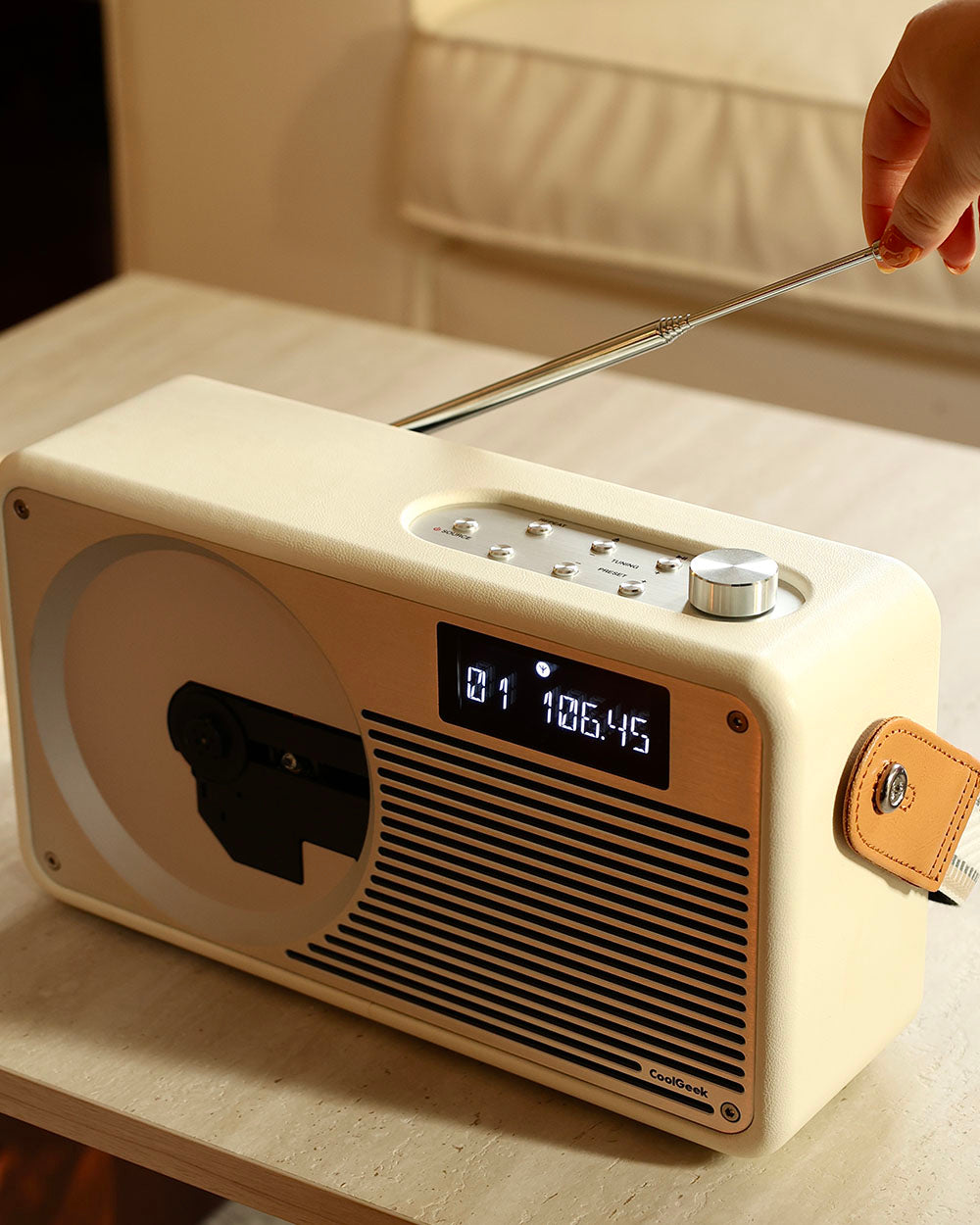 CoolGeek’s vintage CD Bluetooth player pays homage to timeless industrial design with a refined blend of precision-machined metal and handcrafted leather.