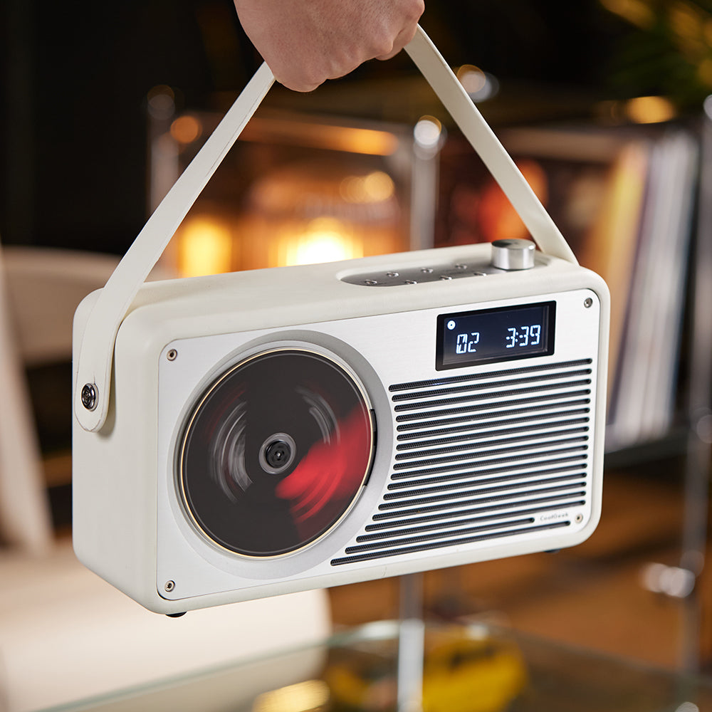 O tocador de CD Bluetooth vintage da CoolGeek presta homenagem ao design industrial atemporal com uma mistura refinada de metal usinado com precisão e couro feito à mão.